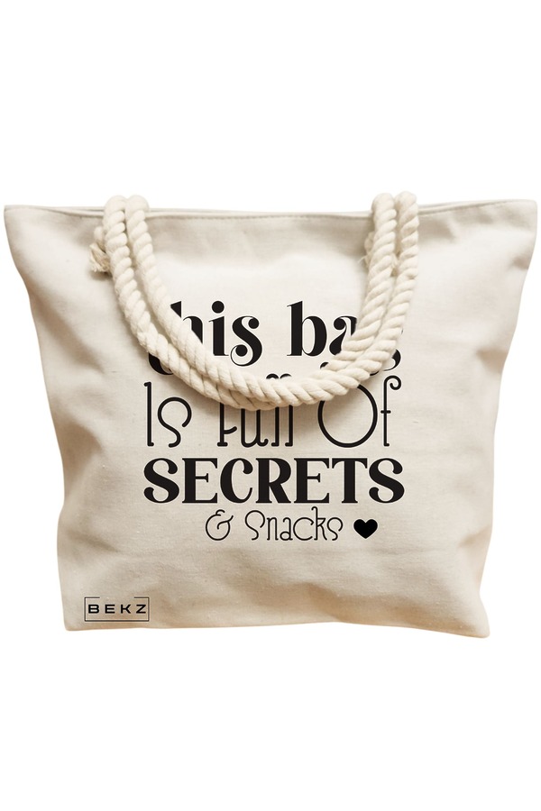 Geanta de Plaja Canvas Tote pentru femei, model Full of secrects and snacks 2, 40×51 cm, Bej, BEKZ®