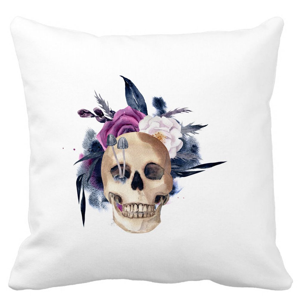 Perna Decorativa cu motiv Craniu si Flori de Halloween, 40×40 cm, Alba, Mata, Husa Detasabila, Burduf
