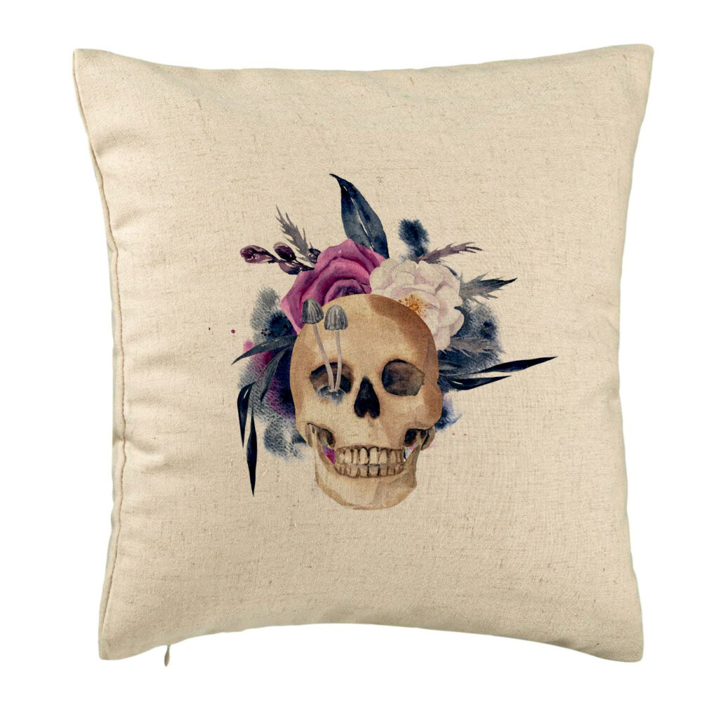Perna Decorativa cu motiv Craniu si Flori de Halloween, 40×40 cm, Bej, Husa Detasabila, Burduf