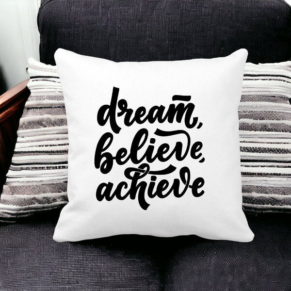 Perna Decorativa, Dream Believe Achieve, 40×40 cm, Alba, Mata, Husa Detasabila, Burduf