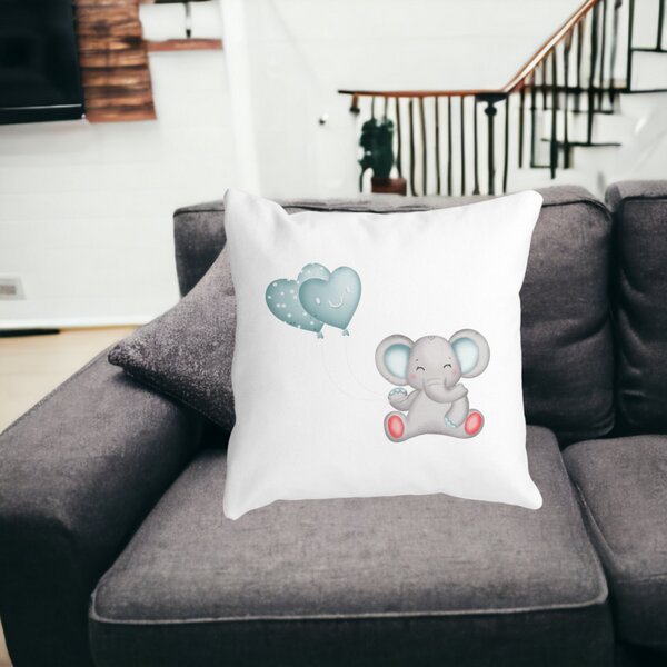 Perna Decorativa Elefant si baloane in forma de inimioare, 40×40 cm, Alba, Mata, Husa Detasabila, Burduf