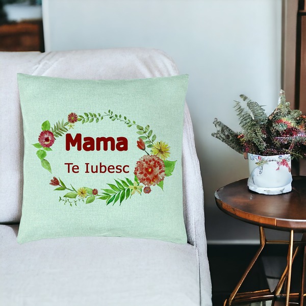 Perna Decorativa, Model Pentru Mama Te iubesc 2, 40×40 cm, Verde Menta, Husa Detasabila, Burduf